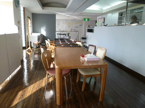 ![]() 食堂は壁面のガラスブロックから優しい日差しが入ります |