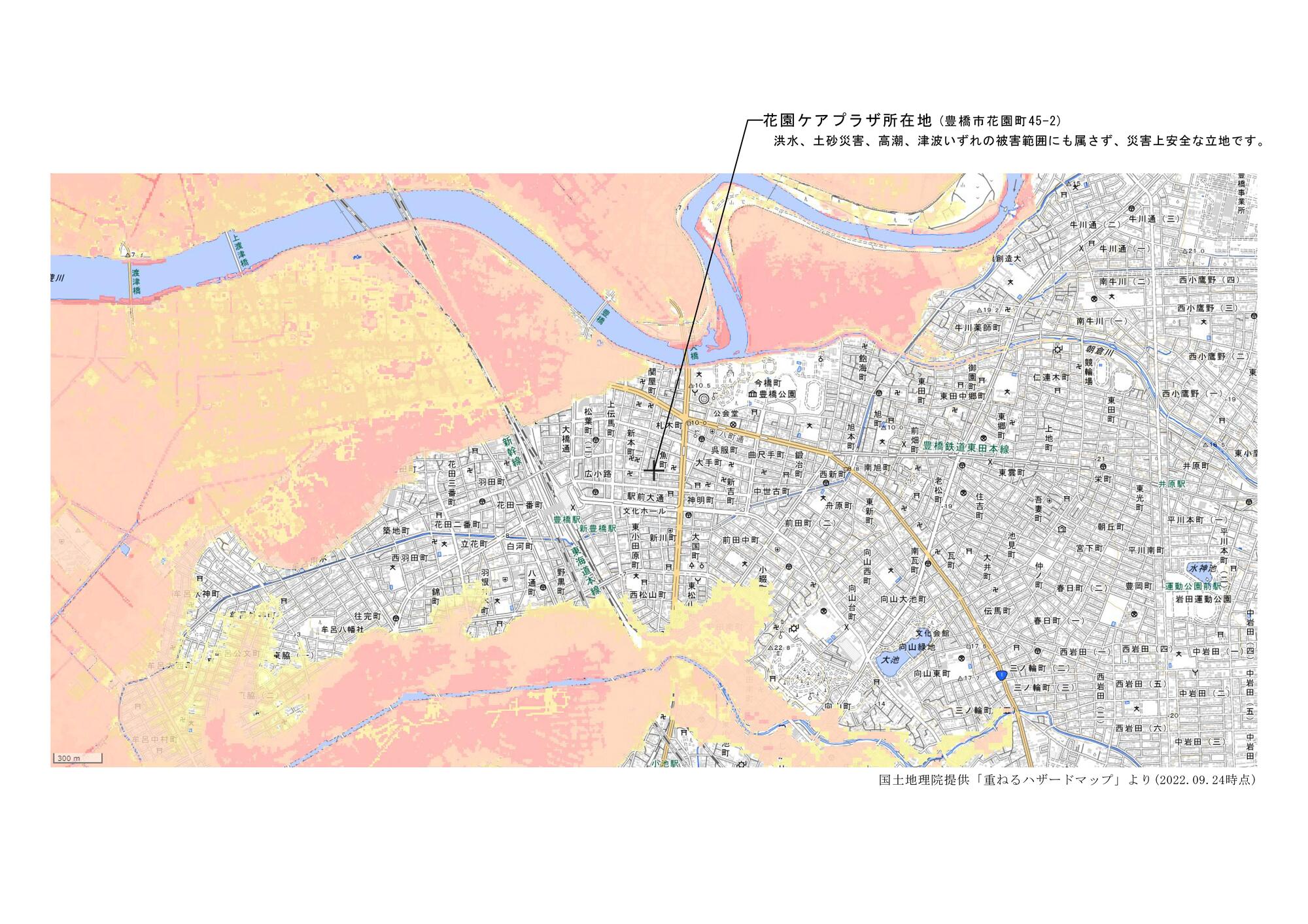 花園ケアプラザデイサービスは、豊橋市中心市街地の花園町に開設されました、デイサービスを中心とした介護施設です。この地域、花園町は古くから魚町、繊維問屋街、花園商店街と豊橋の皆様に愛されていた場所にございます。今も多くの寺院があり、落ち着いた風情を醸し出しております。水害や土砂災害に対して安全な立地です。 |